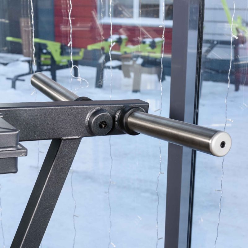 - Для безопасного начала и завершения подхода предусмотрен стартовый рычаг, расположенный на уровне подплечников. Стартовый рычаг фиксируется в двух положениях (выше/ниже), удерживает подвижный узел и позволяет пользователю комфортно занять стартовое положение и безопасно завершить упражнение.
