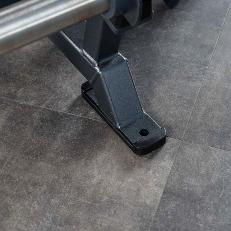 - Прямоугольные подпятники из износостойкой резины имеют металлическое основание и отверстия для фиксации к полу. Такая конструкция гарантирует устойчивость тренажёра, равномерное распределение нагрузки и защиту покрытия от механических повреждений.