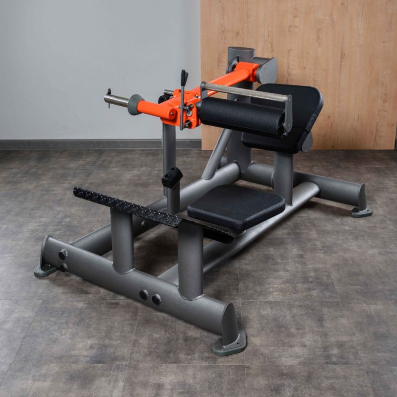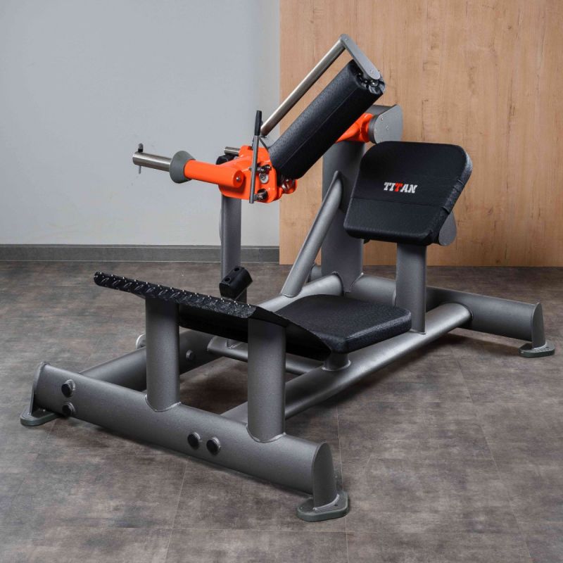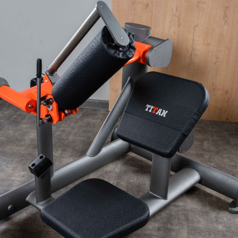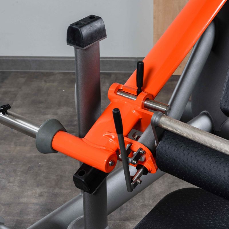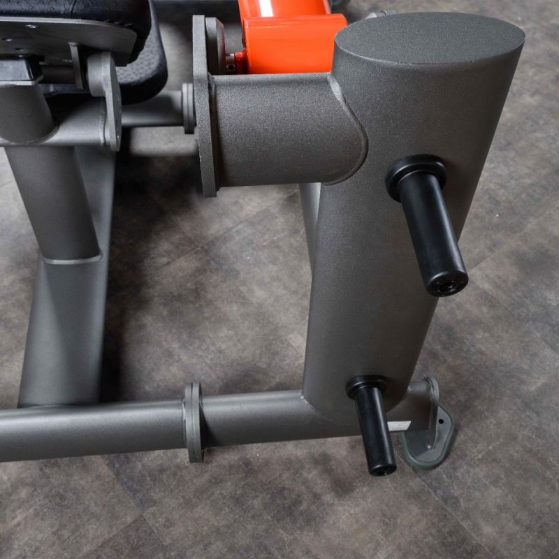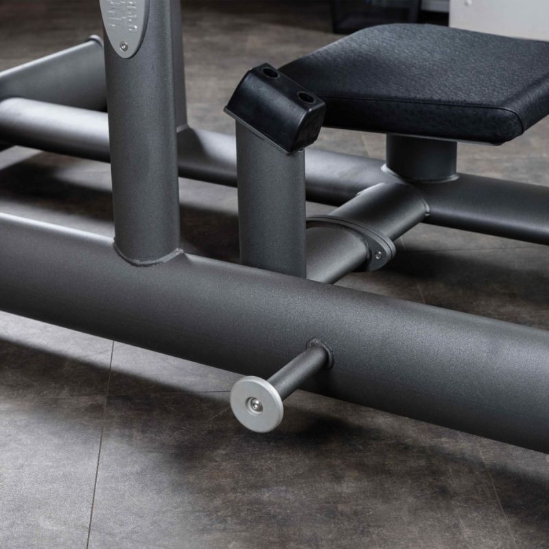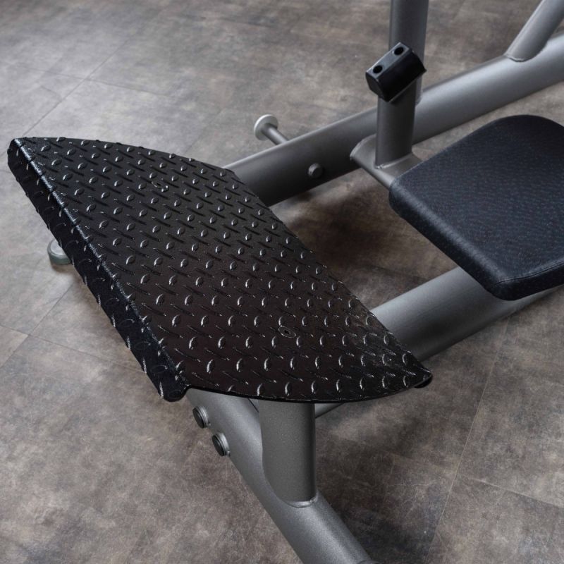 - Платформа для ног выполнена из рифлёного стального листа толщиной 4 мм, исключающего соскальзывание во время выполнения упражнения. Платформа установлена под углом для естественного положения стоп при разгибании таза, не регулируется.