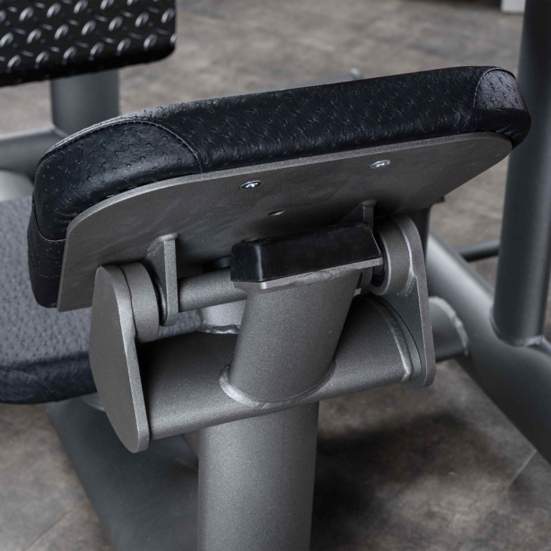 - Спинка установлена на подшипниковом узле, обеспечивающем небольшое амплитудное движение при выполнении упражнения, и снабжена задним демпфером, предотвращающим контакт металлических элементов при отклонении. Спинка нерегулируемая.