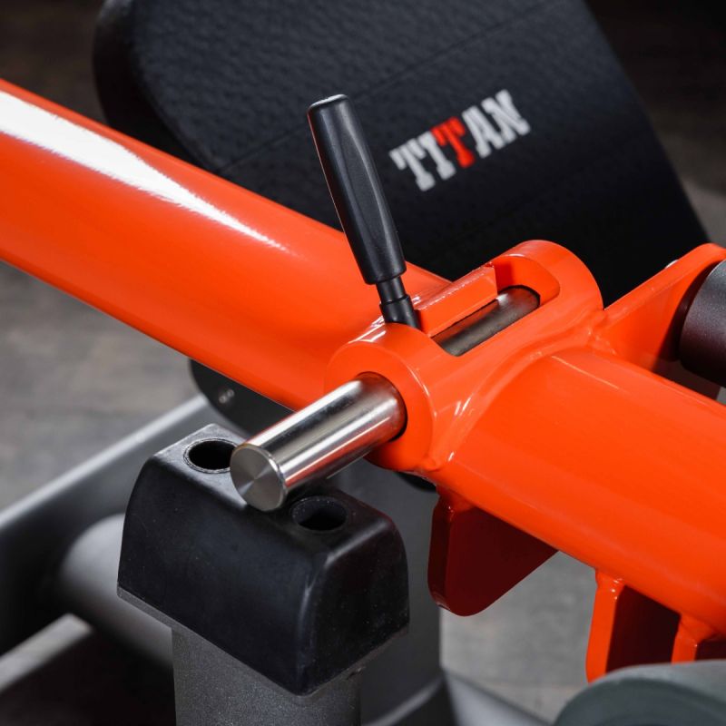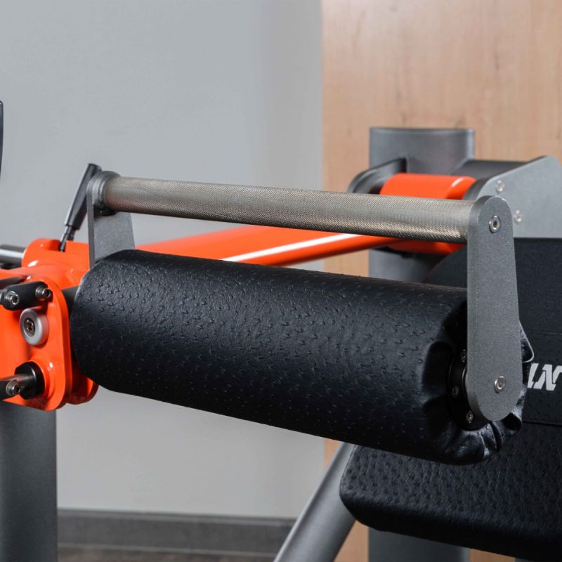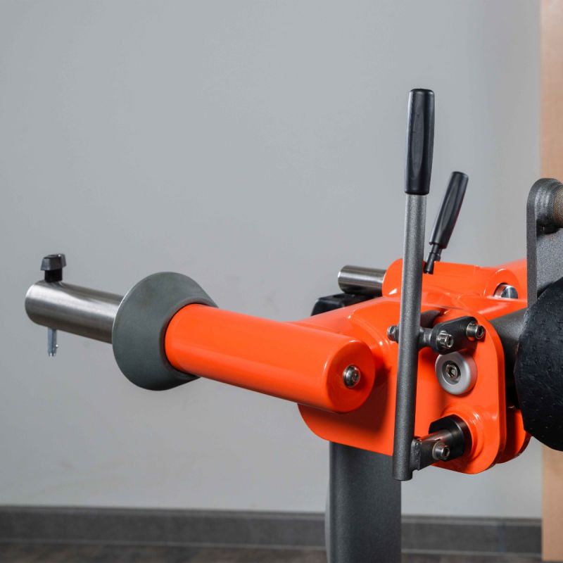 - Узел «валик–рукоять» оснащён механизмом откидывания для удобного захода и выхода из тренажёра. Управление производится при помощи рычага фиксации, расположенного справа от валика. При потягивании рукояти на себя валик поднимается вручную и фиксируется в верхнем положении.