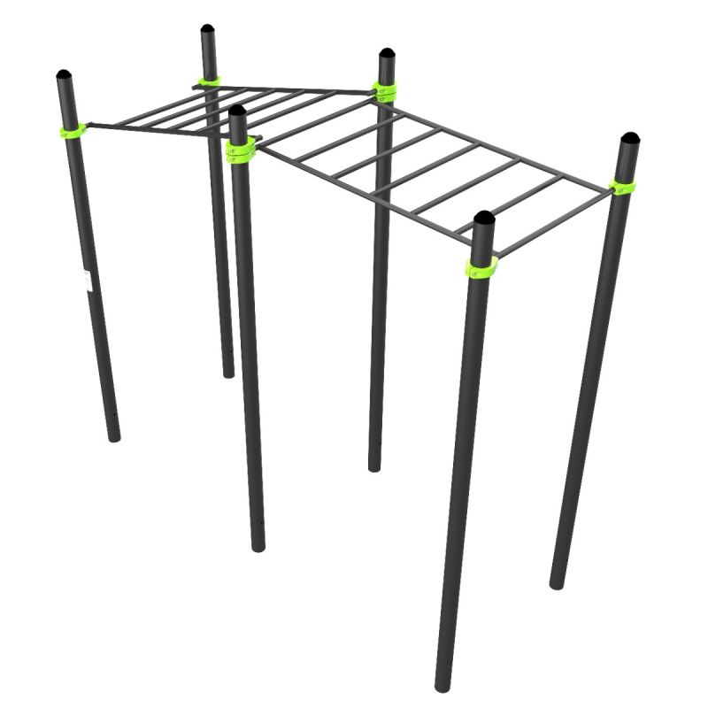 Два типа рукоходов в одном комплексе: горизонтальный и в подъём. Такое сочетание расширяет тренировочные возможности и помогает прорабатывать мышцы под разными углами нагрузки. Отлично подходит для интенсивных воркаут-тренировок на силу и координацию.